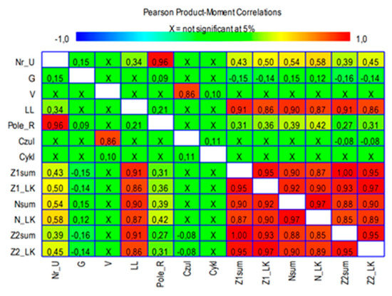 Table 2). The statistical analysis started with the verification of the obtained data to remove gross errors that may have appeared in the database, resulting, for example, from human oversight (e.g., entering incorrect data). In the next step, the correlation between the parameters taken into account in the analysis was examined. There are 13 such analysed values. They include damage number (Nr_U), number of cut cords (LL), area of damage (Pole_R), three parameters connected with the measurement system (belt speed—V, measuring probe distance—G, sensitivity—Czul), the measurement cycle taken into account (Cycle) and the failure description, including two values for each of the three damage sub-areas (yellow field before damage—Z1, blue field—N and yellow field behind the damage Z2). The measured damage parameters are the sum of the lengths of the signals recorded in the measurement channels (Z1sum, Nsum, Z2sum) and the number of channels recording the signal related to a given sub-area (Z1_LK, N_LK, Z2_LK).