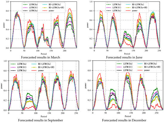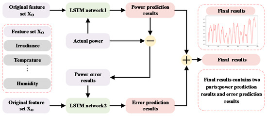 Another common method to improve prediction accuracy is to change the structure of the model [23,24,25,26,27,28]. The convolutional neural network (CNN) embodies powerful capabilities in image processing [29]. In recent years, more and more CNN-based models have been used to forecast PV power and have achieved good results. The CNN network can extract the features of the original data well, but it is not good at dealing with timing problems. A recurrent neural network (RNN) is considered to be a more effective tool for time series data prediction. In previous work, some researchers demonstrated that RNN has better prediction performance than backpropagation NN (BPNN) and radial basis function NN (RBFNN) [30,31]. Unlike the aforementioned studies, some researchers introduced the concept of residuals into the model design [32]. By establishing an additional error prediction model, the prediction error is added back to the prediction result to obtain the final prediction result. This method cleverly introduces error compensation terms to improve prediction accuracy. Based on this, and considering the superiority of LSTM networks in time series problems, a hybrid model, the bias compensation–long short-term memory (BC–LSTM) network, is used to perform the PV power forecasting.