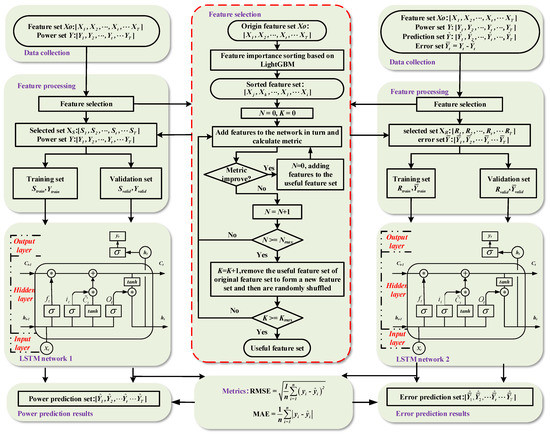 However, traditional bias compensation networks have the following problems. The actual power value and the power error term are generated inconsistently, and the influencing factors are also different. Using the same meteorological data as the model input, its prediction accuracy is poor, and its computational complexity is high. Therefore, a framework with a hybrid method combining feature selection and the BC–LSTM network is proposed where the feature selection method is applied to the two LSTM networks to improve prediction accuracy and calculation efficiency. In this study, a new method based on feature selection and the BC–LSTM network is proposed to forecast PV power. The main contributions are outlined as follows: