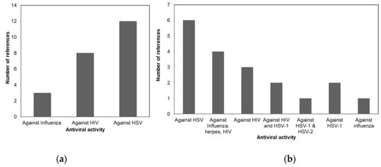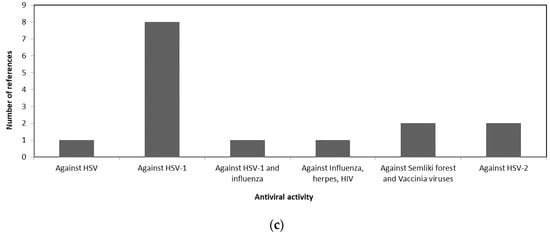 A comparison of the antiviral activity of the three taxa is shown in Figure 1 to illustrate the potential usage of different macroalgae for pharmaceutical purposes. Figure 1a shows that more than 50% of the review papers indicates the potency of Phaeophyceae against HSV. Whereas most of the Chlorophyceae species were reported to have antiviral activity against HSV-1 and HSV-2 as shown in Figure 1b. The antiviral activities of different Rhodophceae species are relatively equally distributed against HSV, HIV, HSV-1, HSV-2, and Influenza virus as shown in Figure 1c.