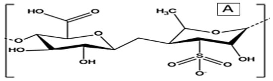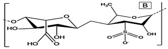 Ulvan is a cell wall polysaccharide that contributes from 9% to 36% dry weight of Ulva’s biomass and is mainly composed of units of mono or disaccharides such as sulphated rhamnose, sulphated xylose, and uronic acids (glucuronic acid and iduronic acid) whereas the remaining sulphated polysaccharides in the Ulva species (cellulose, xyloglucan, and glucuronan) makes only 9% of its biomass []. The most repeated structures of ulvan are shown in Figure 2 and Figure 3.