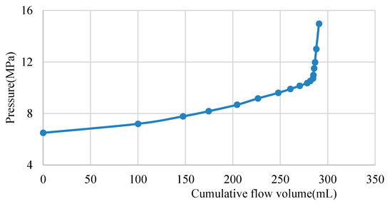 The compound formation water used in the experiments was prepared according to the main components of the formation water of the Yanchang Formation (Table 3). The other parameters of the experiments were determined according to the reservoir parameters of the Yanchang Formation (Table 4). The bubble point pressure test of the compound gas-bearing oil was carried out before the experiment. The result is shown in Figure 1. The bubble point pressure of the gas-bearing oil was 10.72 MPa under the formation conditions.