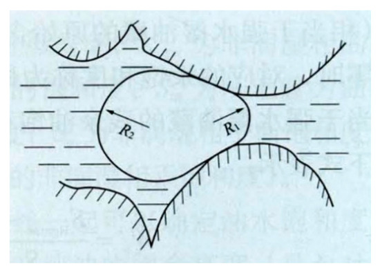 In tight oil reservoirs, when the production pressure is higher than the bubble point pressure, the solution gas in the crude oil was not separated out. This stage is in single-phase nonlinear porous flow, which mainly relies on the elastic energy of the oil, and the resistance gradient is mainly caused by the oil phase alone [44]. When the pressure is lower than the bubble point pressure, the solution gas separates out. The oil and gas two-phase porous flow first occurs near the bottom of the well, and then it expands further into the formation. Then, a resistance gradient forms as a result of the oil phase and the Jamin effect generated by the gas phase. The Jamin effect is the resistance generated when the gas passes through the throats (Figure 2). The smaller the radius of the throats, the greater the resistance.