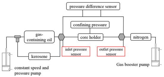 The experimental process is shown in Figure 3. It consists of three systems: a gas-bearing oil blending system, a displacing system, and a back pressure controlling system. The gas-bearing oil blending system includes a TC-100D constant speed pressure pump, a PVT apparatus, and an intermediate container filled with kerosene. The displacing system includes a core holder, a confining pressure pump, inlet and outlet pressure sensors, a differential pressure transducer with an accuracy of 0.0015 MPa, a computer, and recording software. The back pressure controlling system includes a piston-equipped container and a nitrogen constant pressure pump. All cores were aged and saturated with compound formation water for three days before the experiment. The experiment was carried out in a constant temperature system.