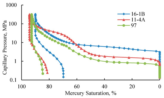 The high-pressure mercury intrusion curves of the three cores are shown in Figure 4. Core 16-1B has the highest median pressure (5.7 MPa) and displacement pressure (3.1 MPa). Cores 11-4A and 97 have lower pressures of 2.8 MPa and 0.8 MPa and 2.3 MPa and 0.4 MPa, respectively (Table 5). This demonstrates that core 16-1B has relatively narrow throats, with a median radius of 0.1289 μm, while core 11-4A and core 97 have wider throats, with median radii of 0.2542 μm and 0.3067 μm, respectively.