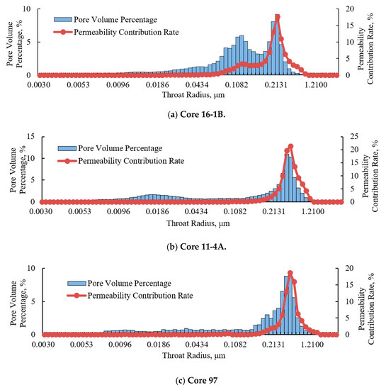 According to the experimental results, the pore volume percentage and permeability contribution rate were calculated (Figure 5). The radii of the throats that mainly contribute to the permeability of core 16-1B mainly range from 0.05 to 0.30 μm, and the peak value of the permeability contribution curve is located at a throat radius of 0.18 μm. The radii of the throats that mainly contribute to the permeability of core 11-4A mainly range from 0.15 to 0.70 μm, and the peak value of the permeability contribution curve is located at a throat radius of 0.34 μm. The radii of the throats that mainly contribute to the permeability of core 97 mainly ranging from 0.15 to 0.80 μm, and the peak value of the permeability contribution curve is located at a throat radius of 0.39 μm. Thus, as the permeability increases, the number of wider throats increases, and the curves gradually move toward the right.