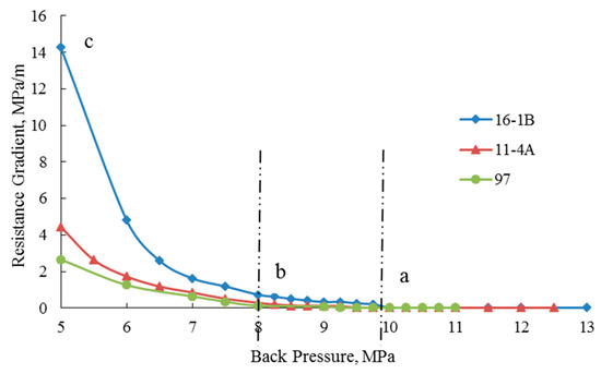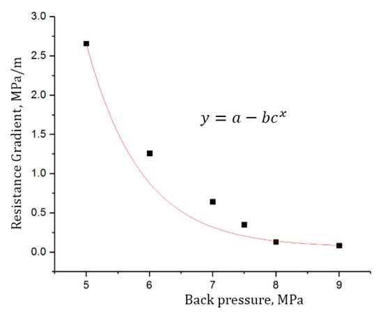 The porous flow resistance gradient under different back pressures was calculated according to the equation that defines the resistance gradient. The relationship between the back pressure and the resistance gradient of the three cores is shown in Figure 6. As can be seen: