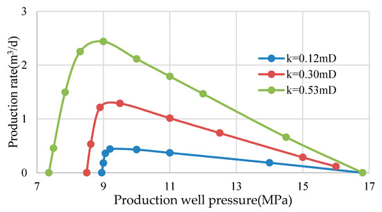 As can be seen from Figure 14 and Figure 15, before degassing, the production rate of the oil wells basically increases linearly as the production well pressure decreases; and the higher the permeability, the greater the production rate. After degassing, the production rate decreases rapidly. The degassing process is relatively late, with a higher permeability; the decrease in the production rate is relatively gentle, and the production pressure can be reduced to a lower level. After fracturing, under the same conditions, the decrease in production after degassing is gentler than that before fracturing, and the production pressure can be reduced to a lower level.
