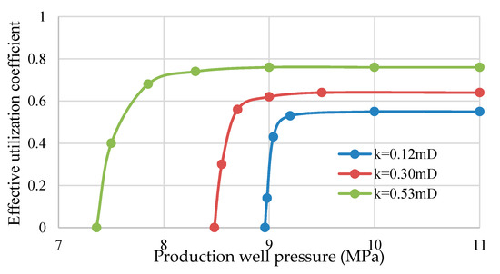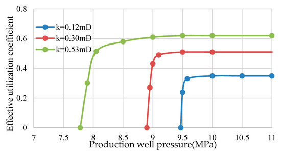 When the pressure of the production well drops below the bubble point pressure, the solution gas separates out, and the effective utilization coefficient initially decreases slowly and then decreases rapidly. The lower the permeability, the steeper the downward trend. Under the same pressure, the effective utilization coefficient is larger after fracturing than before fracturing; and the lower the permeability, the greater the increase (Figure 16 and Figure 17).