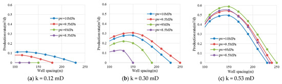 The relationship between the production rate and the well spacing before fracturing.
