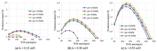 After fracturing, the production rate under the same conditions increases significantly, and the suitable well spacing increases significantly. Fracturing can effectively increase the output after degassing. A formation that cannot be utilized before fracturing because the throats were blocked by the separated gas can also produce some output. When the production well pressure is not much lower than the bubble point pressure, the fracturing effect is better (Figure 19).