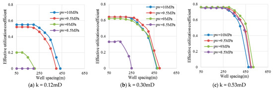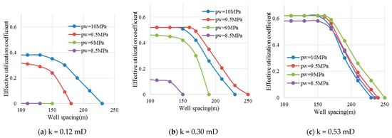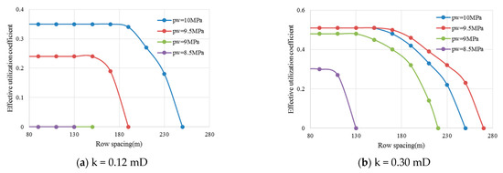 As the well spacing increases, the effective utilization coefficient initially remains steady and then gradually decreases. Before degassing, the lower the production well pressure, the later the effective utilization coefficient decreases, and the larger the suitable well spacing. After degassing, the effective utilization coefficient decreases earlier, and the suitable well spacing decreases. Under the same conditions, the effective utilization coefficient of the formation with the high permeability is larger, and it is less affected by the production well pressure after degassing (Figure 20).