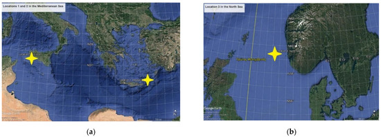 Examined installation locations (yellow stars) for the REFOS platform: (a) two locations L1, L2 in the Mediterranean Sea; (b) one location L3 in the North Sea (from Google Earth).