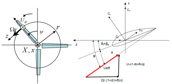 The aerodynamic loading is defined within the context of Blade Element Momentum theory [52,53]. Hence, two nonlinear equations are applied for the induction factors and that specify the effective angle of attack a and the effective relative velocity (see Figure 5), i.e.,: