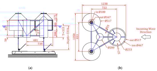The Renewable Energy Multi-Purpose Floating Offshore System (REFOS) structure encompasses an array of hydrodynamically interacting OWC devices, moored through tensioned tethers as a TLP platform supporting a 10 MW WT. The system consists of a triangular platform supported by cylindrical floaters with the WT mounted on a supporting central cylinder at deck’s center and the cylindrical OWC devices at its corners. The OWC consists of two concentric cylinders, with the water entering through the subsurface opening into the annular chamber between the two cylinders that contains air. The wave action causes the captured water column to rise and fall like a piston, compressing and decompressing the air. As a result, there is an air flow moving back and forth through an air turbine coupled to an electric generator. In the center of the platform a cylindrical solid body is arranged to support the WT. The general arrangement of the floating supporting structure is depicted in Figure 1.