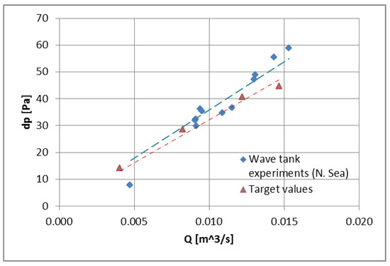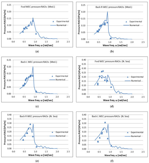 Here, is the air volume flow through the air turbine of the i = 1, 2, 3 OWC device, whereas is the rotational speed of turbine blades, the outer diameter of turbine rotor, the static air density and the device’s air chamber volume. The empirical coefficient depends on the design, the setup, and the number of turbines. The real part of is related to the pressure drop through the turbine, whereas the imaginary part of is associated with the effect of the thermodynamics of the compressible flow inside the OWC chamber and through the air turbine.