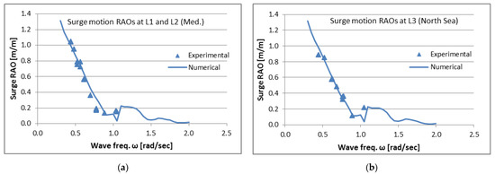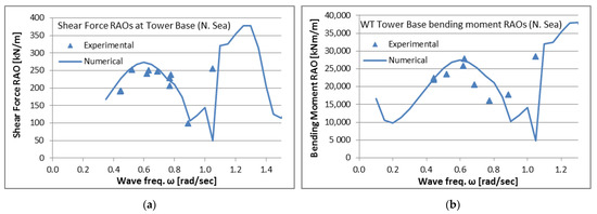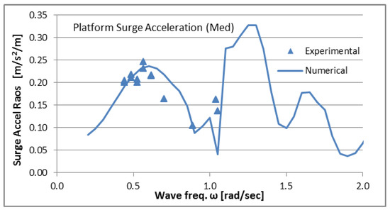 - For the case of the harmonic waves, a wide range of exciting frequencies was examined, and the corresponding response amplitude operators (RAOs) were derived (the sea keeping response of the platform in surge motion; the platform’s accelerations; the dynamic tendon loads; the OWC air chamber pressure and the WT tower base loads). The obtained RAOs were found to be in very good agreement with the numerical hydrodynamic analysis presented herein. This verifies the software tools developed in the context of the project.