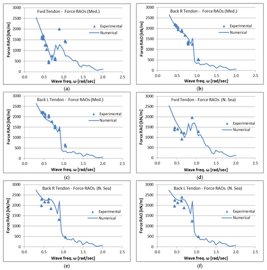 In Equation (28) , are the platform’s water plane area and its moments of inertia about x and y axis, respectively; U and Q are the buoyancy and weight of the platform, respectively; are the vertical coordinates of buoyancy and gravity center, respectively, which for the REFOS design are equal to , respectively; ρ is the water density and g the gravitational acceleration constant. The are the tendon pretension forces and are the horizontal and vertical coordinates of the attaching point of the tendon with respect to the platform’s global reference point of motion and L is the tendon’s length. The have negative values denoting those that are placed below the free surface. The mass moments of inertia are depicted in Table 2.