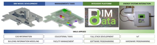 Donghwan Lee, et al. presented an optimization of operational techniques by using a control monitored system linked with BIM models [28]. Deeper research was carried out by Kung-Jen Tu and D. Vernatha [31]. This project showed the exploration and application of BIM-based energy management system, hosting environmental sensors, BIM model, energy simulation tools and data warehouse. In this study, a different perspective of a monitoring system was developed. Through an intelligent platform with no commercial software, the whole management of the building can be performed from both the data management and the visual point of view. In addition, specific maintenance tools for each type of user were created. In the same sense, self-developed hardware was implemented too in order to monitor temperature and occupancy. As a mode of conclusion, this study shows the entire process starting from zero and the needs for the transformation of an outdated building into an intelligent and efficient one, which implies a significant advance in the state of the art.