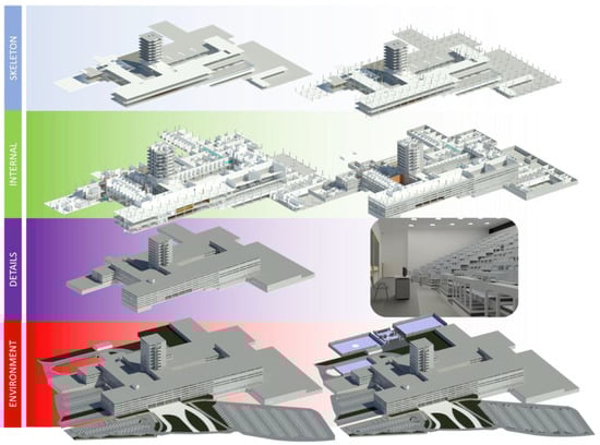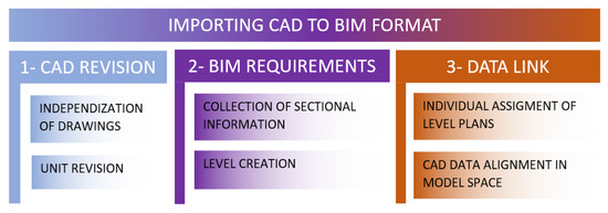 As indicated in the methodology subsection, the initial step of the project was the manufacture of a tri-dimensional model of the building and other depending facilities using BIM possibilities. With the complex characteristics of the building, the BIM model hosted many challenges. An initial BIM Execution Plan (BEP) was detailed. Main points of the ISO 19650 [24,25] were studied and applied considering aspects such as the Level Of Information (LOI) required. In this way, the infrastructure was divided into public and private areas. Public zones were related to all accessible areas inside and outside the building where a standard user could access. Private areas encompassed other relevant spaces such as laboratories or private offices. CAD ground layouts and manual measuring of all height levels was made. The initial steps related to the CAD to BIM information transformation is attached in Figure 2. Once the CAD information was attached to the model, internal and external modelling begun. All the aspects indicated in BEP, considering the future management tasks, defined the LOI associated to each zone. A high LOI was assigned to public areas and a lower LOI to the private zones. The modelling process can be seen in Figure 3.