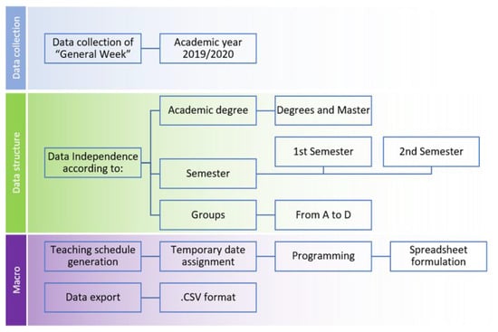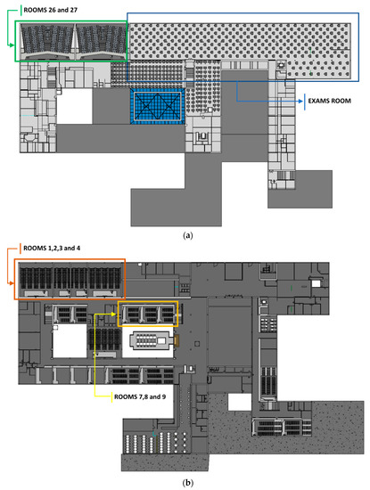 Related to COVID-19 context, new management tools were designed and implemented to the initial utilities detailed in Figure 4 and Figure 5. As a complex building with classroom capacities over 200 students in specific cases, occupancy for different time steps along the day is a highlighted fact to consider. For this purpose, a transport engineering technique to study the movements along a region was considered. Origin-Destination Matrixes (O-DM’s) where applied inside the infrastructure. Further details can be found in references [25,26]. The building was divided in areas where O-DM’s were applied. A selection of the most important classrooms and special spaces like cafeteria or public transports zone were selected to be implemented in the mentioned matrixes.