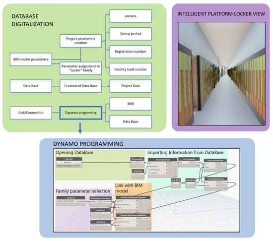 Considering the management parameters, a locker management system linking spreadsheets with BIM lockers elements was carried out through use of Dynamo programming, as it is indicated in Figure 5. The figure shows a simple process of information linking between spreadsheets as databases and the BIM infrastructure model of the ETSICCP. The spreadsheet data structure hosts main management information needed for locker reservation, such as owner, rental period or registration number. By using Dynamo, internal elements of the BIM model and its parameters could be filtered and modified through dynamo commands. The impact of dynamo in this research project decreased as phases advanced due to the implementation of complete programming system although it is of great interest for the intercommunication of BIM models and datasheets in the conventional development of projects.