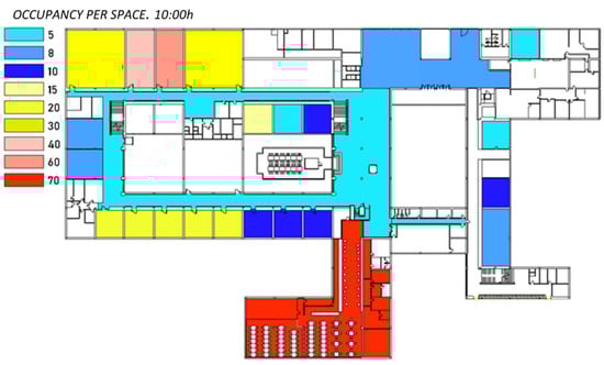 All occupancy criteria or capacities were linked to the BIM model providing users and management staffs with graphical visualization of those parameters. An example is provided in Figure 6, where occupancy for 10:30 h of an example day is showed.