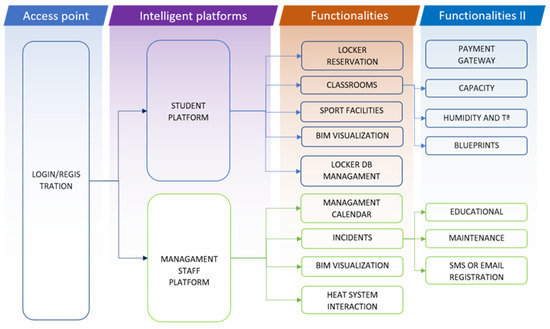 Intelligent platform begins in the login form for all users. Once the user is registered in the platform, according to the privileges, the session will be redirected to one system or another. The first one is related to the student management system. Currently, five functionalities have been developed in this platform. Locker reservation provides the student with the possibility of locker reservation. Considering parameters as floor or the type of locker, the user is redirected to a payment gateway where any credit or debit card is accepted. When the process is over, a PDF is generated to be delivered to the management staff and receive the key. Regarding the classrooms, capacity, humidity and temperature can be detected and saved in a historical SQL database. Of course, an online BIM visualization environment is provided to the user, where students can navigate along the building.