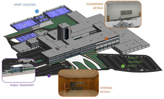 Starting with the internal modelling focusing on management tasks, step by step, the model has been growing up holding even external spaces. Sports facilities, main roads or public transport system have been modelled too and new management techniques are currently being investigated. In Figure 8 the current state of the BIM model is showed.