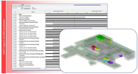 One of the conclusions obtained was that it was possible to reach the total synchronization of all the degree schedules along the infrastructure with the BIM model. The complete digitalization of the schedules was carried out inserting it into worksheets databases. The next step was linking those databases to different space and space properties. In Figure 9, the results of implementing the schedules and databases into the BIM model are shown. As can be seen, the BIM model reflects the actual occupied zones through daily schedule. The color code shows to what degree belongs the lecture on course at the classroom.