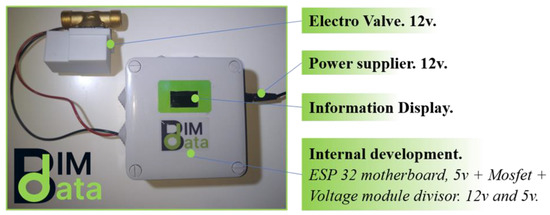 While the implementation process was studied, it concerned us about the massive commercial software in the marketplace. However, a single platform with no possibility of interaction was the only solution. Considering the management needs related to ETSICCP, heat systems stand out over other systems. A heat system with no division properties causes important costs on the monthly gas billing. Hence, a new sensor integrated with the intelligent platform was developed. The hardware is based on a ESP32 motherboard and a Solenoid valve. The programming code links the hardware with the platform and its activation depends on the developed algorithms provided to the management staff. Hardware and a solenoid valve are shown in Figure 12. While intelligent management cloud platform is based on Python language, the sensors were based on C++ programming language. The intelligent platform connects each sensor through the internet. ESP32 motherboard connects to an internet domain where data is sent and received. Solenoid valve diameter varies considering the piper sector where it is installed.
