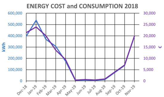 A space analysis consumption was developed thanks to the BIM model of the infrastructure. Volume and area were collected in Table 4. Moreover, using energy billing of the year 2018, all average gas energy consumption and its cost has been detailed in Figure 13.