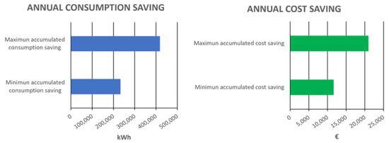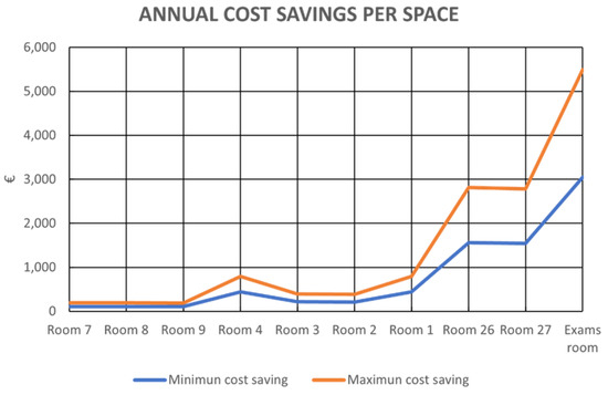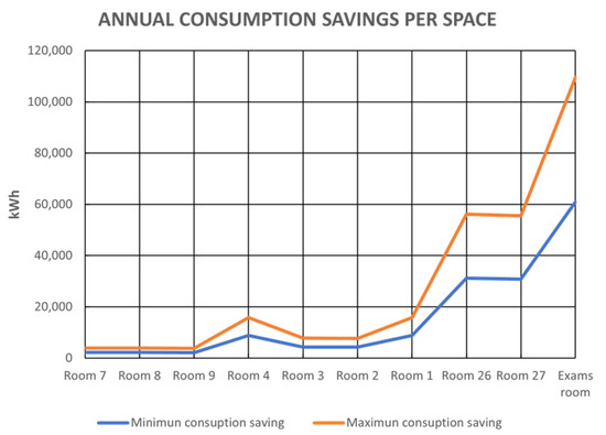 Occupation rates vary from 50% to even less than 10% in specific spaces. That hypothesis provides the maximum and minimum occupation rate and, therefore, economic and consumption savings. In terms of consumption, only the exam room could provide a maximum saving of 109,644.49 kWh each year. Turning it into economic parameters, it could provide a maximum saving of more than 5000 €. Other main spaces such as Room 26 and 27 could provide a total consumption saving of 56,172.12 kWh and a total economic saving of 2812.25 € for each one. Following this analysis, if this research were applied to the whole infrastructure, affecting all spaces, a total saving of 418,928.40 of kWh and 20,963.70 € (17.8% reduction) could be reached in one year period, as it is shown in Figure 17.