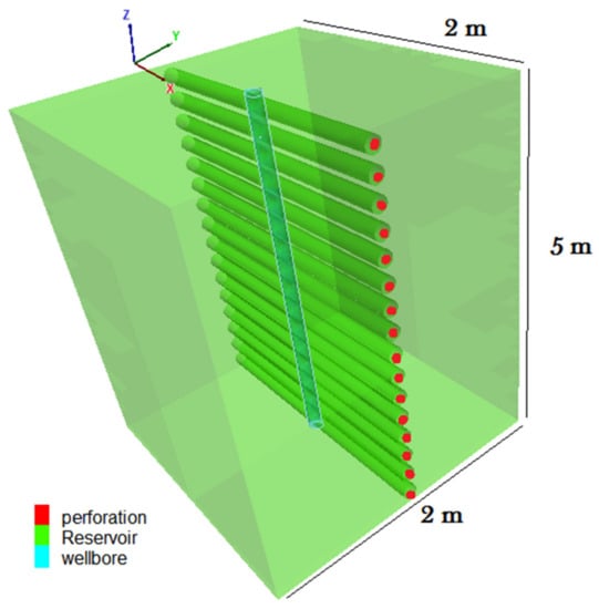 First, a grid was constructed according to the real geometry of the sandstone layer, wellbore, and perforations. The sandstone formation lies between a depth of 2328 m and 2366 m. Thus, the depth of the numerical mesh grid was chosen as 38 m. The wellbore is vertical and its diameter is 21.6 cm. Additionally, the perforations were created perpendicular to the wellbore vertical axis. The direction of the perforations was assumed to be parallel to the maximum horizontal stress, . The diameter of the perforations was 1.7 cm and they were initially created with a vertical spacing of 6 cm from each other. Figure 3 illustrates the generated grid for a typical 5 m of sandstone formation. The scale of the perforations is not graphically accurate; they have only been magnified here for a better view.