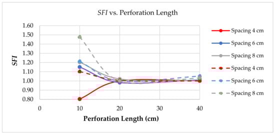 To achieve an optimal SFI, several numerical models with different perforation configurations were simulated and run. Table 2 displays the corresponding values for the mechanical safety factor, hydrodynamic safety factor, and SFI for different models, regarding both σH and σh directions. The obtained values for the real-field case have been marked with an asterisk (*). For all cases, the perforation diameter is constant and equal to 1.7 cm. These results are also shown in Figure 4 (solid lines and dashed lines represent the results for perforations parallel to σH and σh, respectively). According to this figure, when the perforation geometry is the same, a higher SFI is obtained if the perforations are created parallel to σh rather than the σH direction. The maximum SFI is 1.48 and is related to perforations with L (length) = 10 cm, D (diameter) = 1.7 cm, S (spacing) = 8 cm and parallel to σh. On the other hand, the lowest SFI is 0.8 and is associated to perforations with L = 10 cm, D = 1.7 cm, S = 4 cm and parallel to σH. Additionally, it is evident that as the spacing between the centers of perforations increases, the SFI values become larger. However, for a perforation length more than 20 cm, the SFI does not change remarkably.