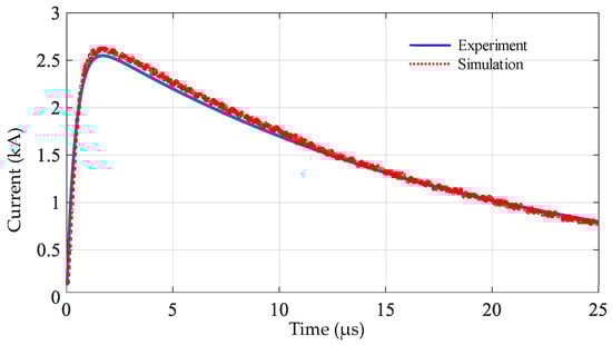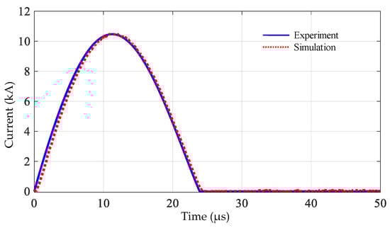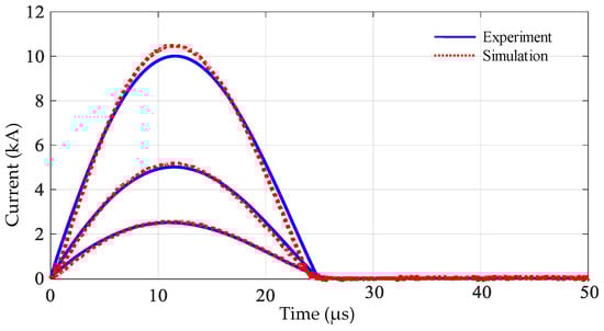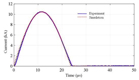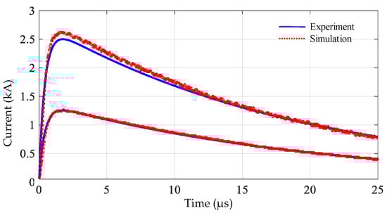 R2) were 26.9 µH, 0.1 Ω, 2.4 µH, and 3.1 kΩ, respectively. Using the model of the 5 kA current peak, the calculated charging voltage to obtain the current peak of 10 kA was 67.3 kV and a charging voltage of 67.5 was set in the experiment. Comparison of the generated currents by simulation with the proposed model and that from the experiment is shown in