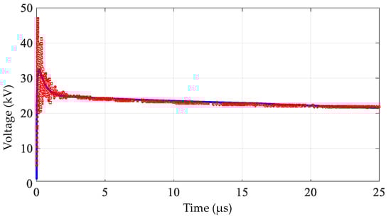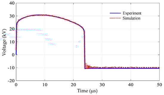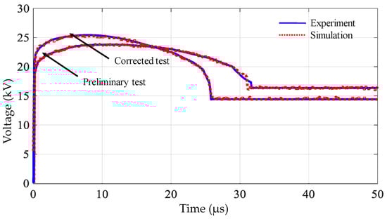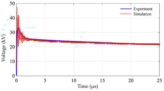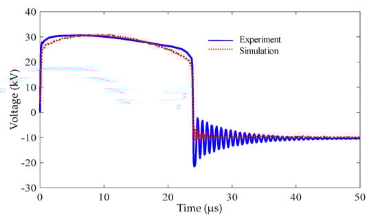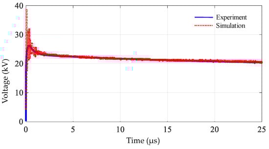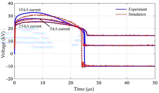 Figure 14. The time to peak of the calculated residual voltage was almost the same as the experimental one. The calculated peak current and voltage deviated from the experimental ones by only 0.55% and 0.35%, respectively.