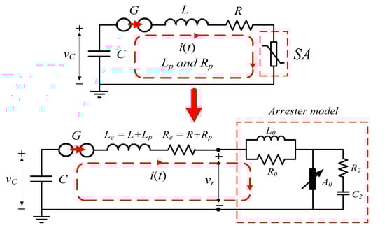 Rp), and the nonlinear characteristic of a surge arrester must be taken into account in the real impulse current generation. The simplified equivalent circuit including the parasitic impedance and the proposed arrester model is illustrated in