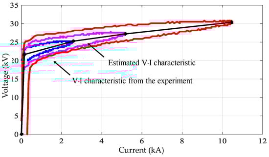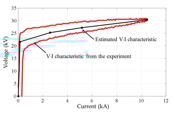 In a similar manner, the proposed technique with the equivalent circuit associated with the current peak of 2.5 kA was applied to search the appropriate charging voltages associated with the current peaks of 5 kA and 10 kA. The piecewise linear curve used to estimate the nonlinear characteristic of the nonlinear resistor (