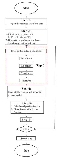 Figure 7, in this paper, a piecewise linear curve drawn through the center of the data of voltage and current of the arrester was employed to represent the characteristic of the nonlinear resistor. A genetic algorithm was employed to search the unknown circuit parameters of the generation circuit and of the arrester model to match residual voltage (