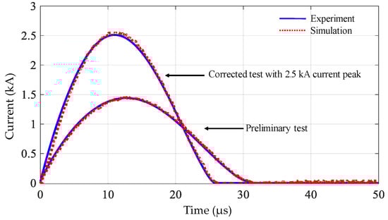 Figure 6. The current and residual voltage waveforms from the preliminary test with the lower current peak specified by the standard were utilized to determine the circuit parameters. Then, the previous determined model and a genetic algorithm were employed to search the charging voltage to obtain the specified current peak.