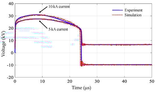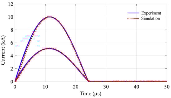 Figure 17. Good agreement was found in the case of 5 kA current peak but deviation occurred in the case of 10 kA current peak. In the case of 5 kA current application, the calculated peak current and voltage deviated from the experimental ones by only 0.73% and 0.88%, respectively. In the case of 10 kA current application, the calculated peak current and voltage deviated from the experimental ones by 4.1% and 8.1%, respectively. However, in terms of current generation in the case of 10 kA current peak, the deviation is acceptable because the current peak deviation of 4.1% was less than 10% according to the standard tolerance.
