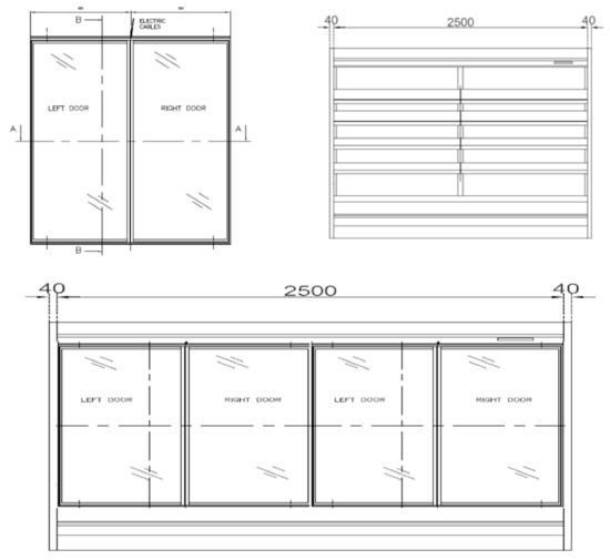 Low-E glass is low heat transfer glass used in buildings [31,32]. Low-E glass is applied to doors and windows to enable buildings with low heat transfer to take advantage of the light coming from outside. Low-E glass was developed to reduce heat transfer by replacing the coating material or replacing the material used in the production of glass films [33,34]. Additionally, it has been developed using double layers, or more glass, to reduce heat transfer [35,36]. The gaps between the glass can also be used to provide insulation by increasing the air gap or adding gases to increase efficiency [37,38]. This research applied low-E glass for doors to be installed in open freezers in order to reduce the uncontrollable factors that can occur with open freezers [39,40]. In this research, two-layer glass was used and argon gas was added to increase efficiency [41,42]. Due to the glass comprising three layers, the size of the door was thick, but the price of argon gas was cheap [43,44]. The 15 open refrigerators in question were equipped with 82 additional doors for store No.1 (R22) and the 15 open refrigerators in question were equipped with 80 additional doors for store No.2 (R404A) [45,46], as shown in Figure 1. The door design must suit the size of the refrigerators, and a strong support part must be designed to support the weight of the door and customer use, as shown in Figure 2 and Figure 3 [47,48].