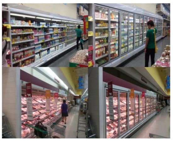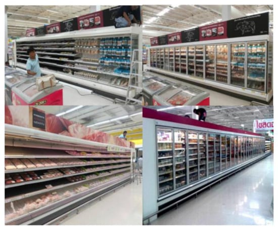 The domestic sector’s energy consumption has the second-highest power consumption rate in Thailand [1]. Retail businesses, which are part of the business sector, continue to grow in response to consumer behavior [2]. Currently, there are more than 2000 supermarkets in Thailand. Most energy consumption in supermarkets comes from refrigeration; thus, a way to reduce energy consumption can be achieved through energy management or the use of high-performance equipment. Most freezers at supermarkets are open freezers so that consumers can see products clearly and access them easily [3,4]. Typically, freezers are designed to provide a strong air curtain in order to maintain low temperatures and control product quality. [5,6]. The air curtain principle, with the front widow making up 80% of total air volume, is responsible for maintaining the temperature of supermarket refrigerators [7,8]. The remaining 20% is the air supply that comes from the back wall inside the refrigerators, and which is responsible for lowering the temperature of the product [9,10]. All winds are combined to return air below [11,12]. Open freezers are affected by a number of external factors that result in heat loads entering the freezer [13,14]. The inefficiency of the air curtain impacts the compressor and increases energy consumption [15,16]. The development of open freezers is still ongoing, but it does not solve the problem of external factors, as expected [17,18]. There are many factors which affect the efficiency of open refrigerators, such as the following: (1) Normally, open refrigerators require a temperature of 25 °C in the store and 60% humidity; (2) the wind of an air conditioner that blows into a refrigerator will reduce the efficiency of its air curtain; (3) customers picking products from inside the cabinet also reduce the efficiency of the air curtain; (4) as does the replenishment of goods by staff; and (5) something obstructing the returned air [19,20]. All of these uncontrollable factors affect the efficiency of the air curtain and directly affect compressor energy consumption [21,22]. This research presents the installation of an energy efficiency improvement solution in supermarkets by the use of a low-E glass door and a digital semi-hermetic compressor to solve the abovementioned uncontrollable factors [23,24]. In addition to being able to maintain its temperature, a closed freezer can control the temperature of an open freezer, and can also help ensure that products do not exceed five degrees Celsius, which is where germs are formed [25,26]. The results of this research will contribute to sustainable energy reductions and the maintenance of quality products for customers [27,28,29,30].