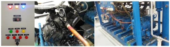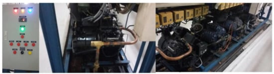 Digital compressors are compressors that can be adjusted during operation in order to suit cooling needs. They were developed as scroll compressors for use in air conditioners [49,50]. A digital semi-hermetic compressor can reduce the duty cycle to suit the current load while, in the unloaded state, not sucking or compressing the refrigerant, resulting in a 50% reduction in compressor energy consumption [51,52]. As for the air conditioner, it can be adjusted according to room temperature. For air conditioners, the cycle can be adjusted according to room temperature by calculating from room temperature and suction pressure, as well as other parameters [53,54]. For refrigeration systems, the cycle can also be adjusted according to room temperature by calculating from room temperature and suction pressure or other parameters [55,56]. However, in supermarkets with high cooling requirements in medium-temperature environments, semi-hermetic compressors are usually used, as shown in Figure 4 and Figure 5. This research proposes energy savings and solves the problem of door installation impacts by the use of compressors, thus reducing frequent compressor cut-offs [57,58]. The result will not only help prolong the service life of the compressor, but will also help to save energy at a specified standard temperature [59,60].