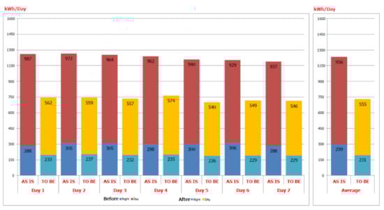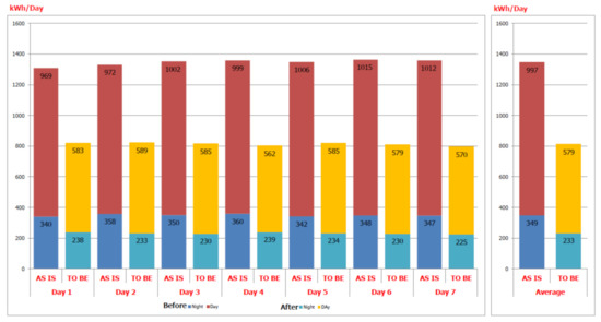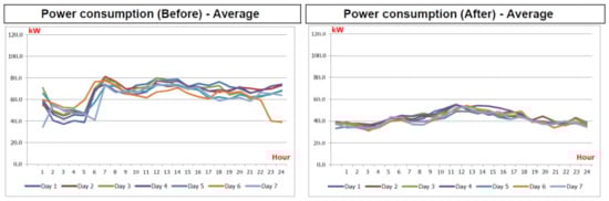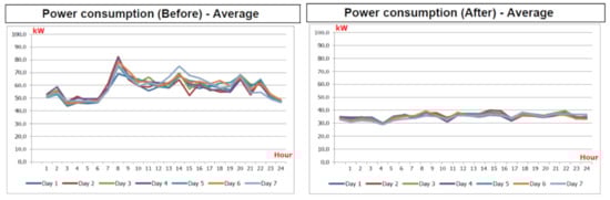 As shown in Figure 8, the maximum and minimum energy consumptions before door installation were 83.25 kW and 44.73 kW, respectively, showing a difference of 46.72%. After installing the door, Figure 9, the highest and lowest energy consumptions before door installation were 33.15 kW and 30.19 kW, respectively, showing a difference of 8.93%. Installing the door led to a reduction in uncontrolled external factors during the day and at night, but a smaller difference in energy consumption was observed, meaning that energy can be saved. Economic results from testing at a 3000-square-meter supermarket, which was open from 6:00 a.m. to 12:00 a.m. and in which we installed 82 doors on 15 open refrigerators, showed a 1.1-year payback period with an energy saving rate of 192,220 kWh/year for store no.1 (R22). As shown in Figure 8, results showed a 1.3-year payback period with an energy saving rate of 171,185 kWh/year for store no.1 (R22).