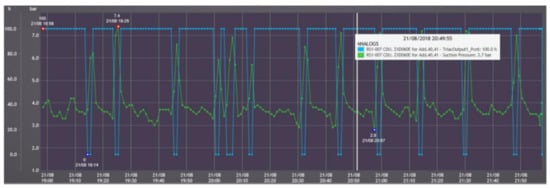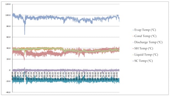 The impact of the door installation results in the compressor stopping and starting frequently, which, in turn, reduces its life. From the effect of temperature against the operating status of the compressor, as shown in Figure 10, it was found that the compressor is stopped by the pump down method, resulting in the evaporator temperature lowering to −20 °C. This is much lower than the design point of −10 °C, as the compressor was stopped many times due to excessive work.