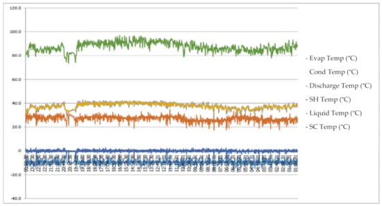 The results of this research were summarized and correlated before and after 7 days using energy and temperature meters with the following parameters: power consumption (W), voltage (V), current (I), power factor (PF), and frequency (Hz). In terms of energy consumption, pre- and post-energy consumption is summarized. Over seven days, we compared the highest and lowest energy consumptions, as separated by day and night. In order to see differences in energy consumption during the closed branch period, average hourly energy consumption was summarized to illustrate consumer behavior. In terms of thermodynamic properties, temperature was measured by the following metrics: temperature (Tev), condenser temperature (Tcd), liquid temperature (Tl), sub cool temperature (Tsc), gas temperature (Tg), and superheat temperature (Tsh). A compressor operation percentage (%) was used to compare compressor action before and after the 7-day period. The compressor design point was at −10 °C evaporator, condensate temperature was at 40 °C, and superheat temp was at 25 °C [61,62,63].