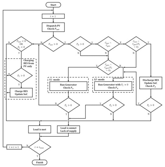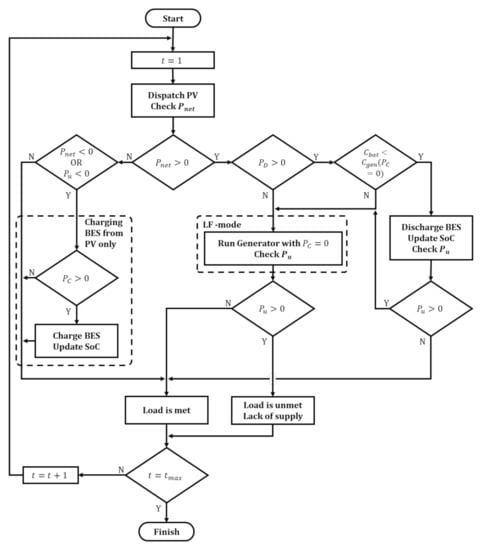 The algorithm of the LF control strategy is presented in Figure 1. The PV is set to supply the required load. If the net required load () is negative, which indicates that there is excess power, then the excess power will be used to charge the battery if the SoC is less than 100% ( > 0). On the other hand, if the net required load is greater than zero ( > 0), the energy is available in the battery ( > 0), and the battery energy cost is cheaper than the cost to run the generator without charging the battery ( < (at = 0)), then BES will be discharged. Otherwise, the generator will be dispatched to satisfy the remaining required load.