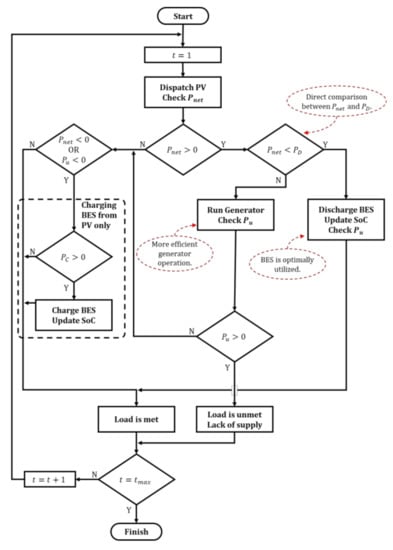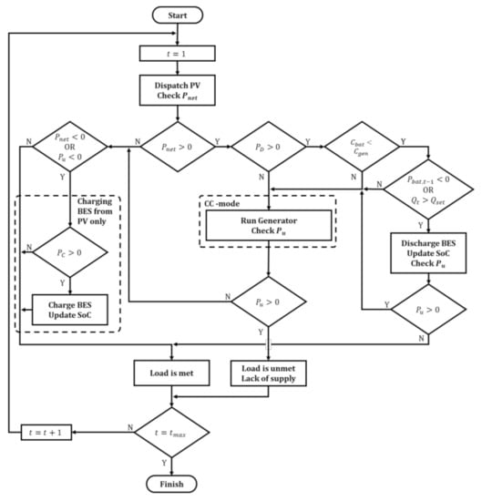 The hybrid power generation system consists of a diesel generator, variable generation of the PV system, and a BES. Each of these power generations is dispatched sequentially to meet the required load depending on the selected dispatch strategy so that the unmet load is equal to zero. First, the PV generated power is dispatched and result in the net required load (), as follows: